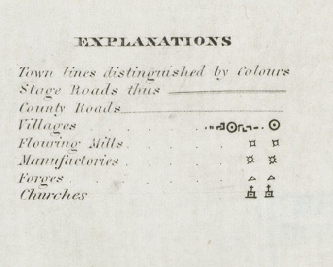 This map shows historic places, stage roads, county roads, villages, mills, manufactories, forges, churches, and more!
