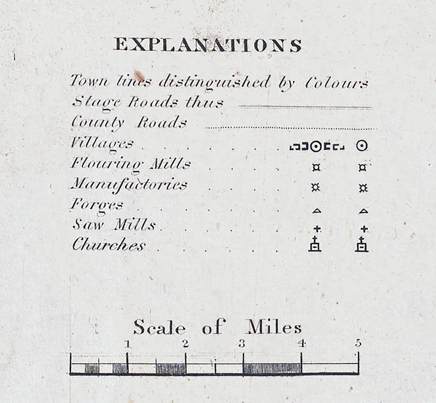 This map shows towns, roads, churches, mills, historic places, water ways, and more.