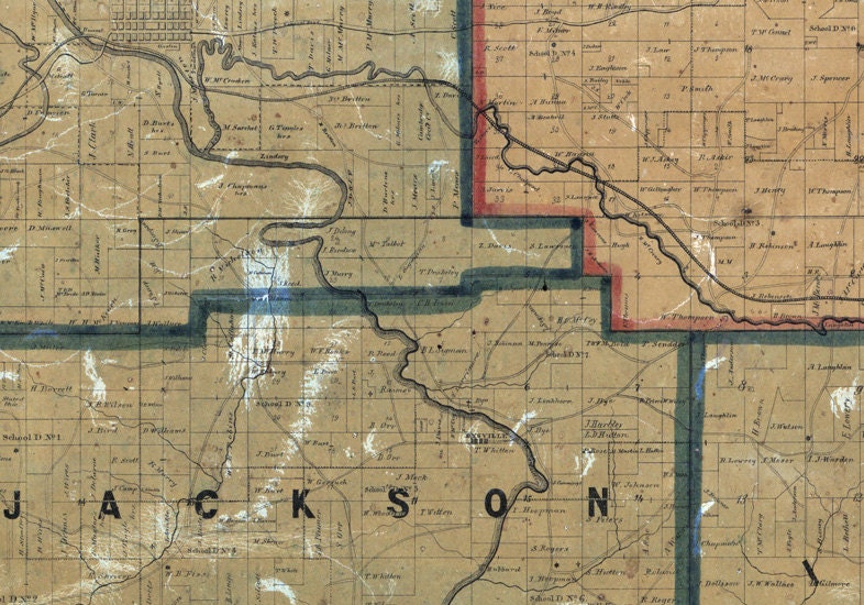 This map shows historical places, farm lines, family names, towns, roads, and more!