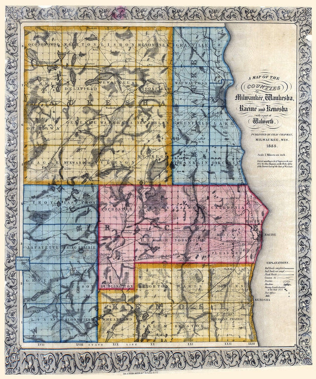 1855 Map of the Counties of Milwaukee Waukesha Racine Kenosha Walworth Wisconsin - 16" x 20" Matte is backordered and will ship as soon as it is back in stock.