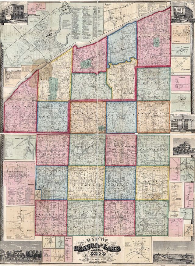1857 Farm Line Map of Geauga and Lake County Ohio Painesville