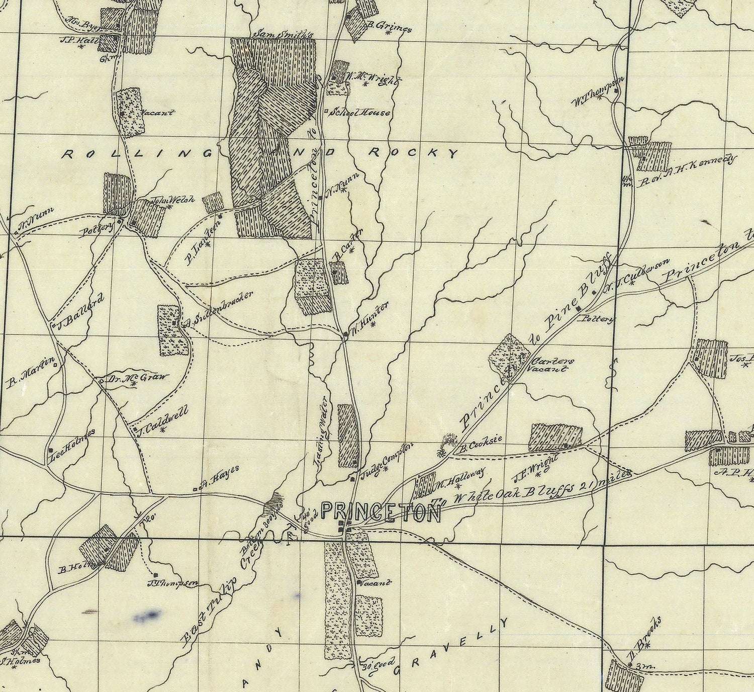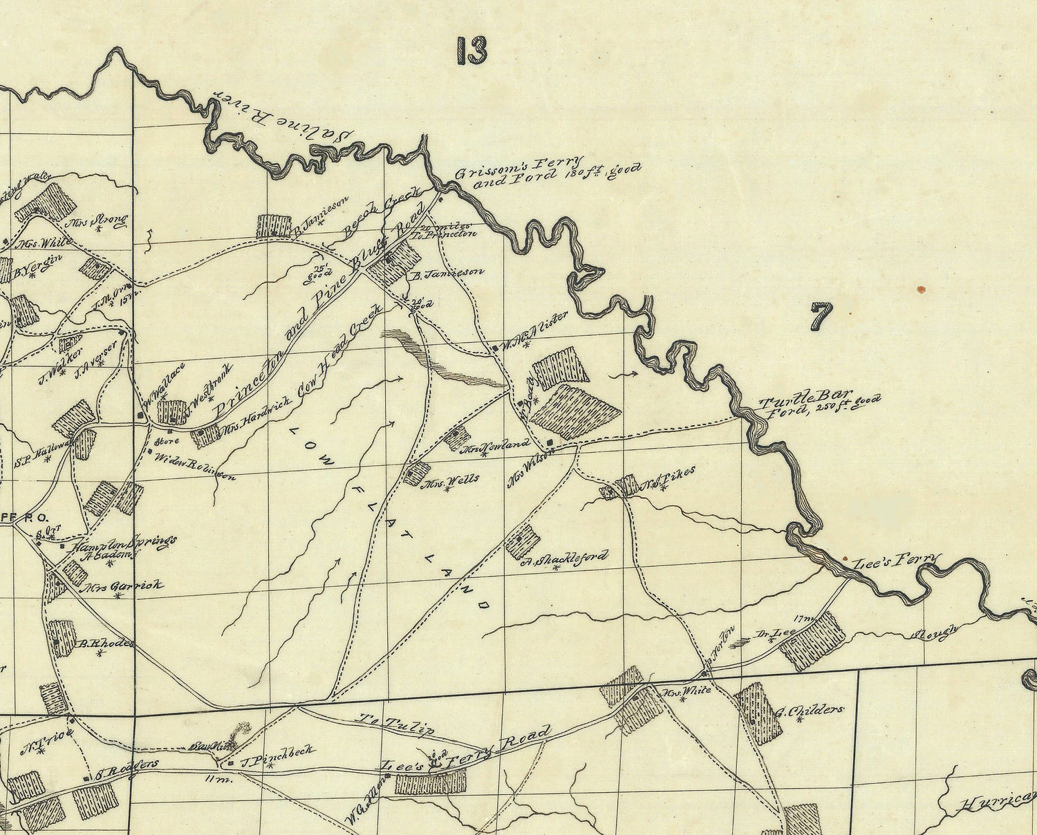 This map shows towns, roads, farms, land owner names, buildings, water ways, and more.