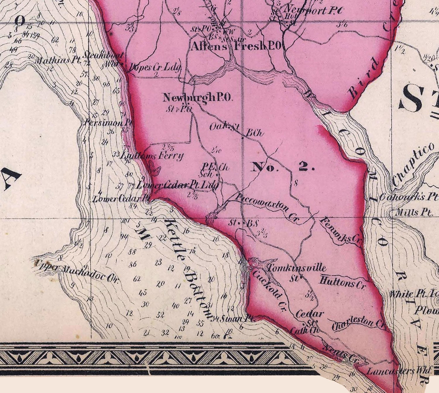 This map shows towns, roads, rail roads, place names, churches, schools, water ways, water depths, and more.