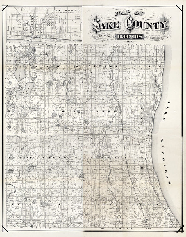 1873 Farm Line Map of Lake County Illinois Waukegan