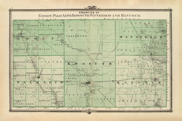 1875 Map of Emmet Palo Alto Kossuth Winnebago and Hancock County Iowa