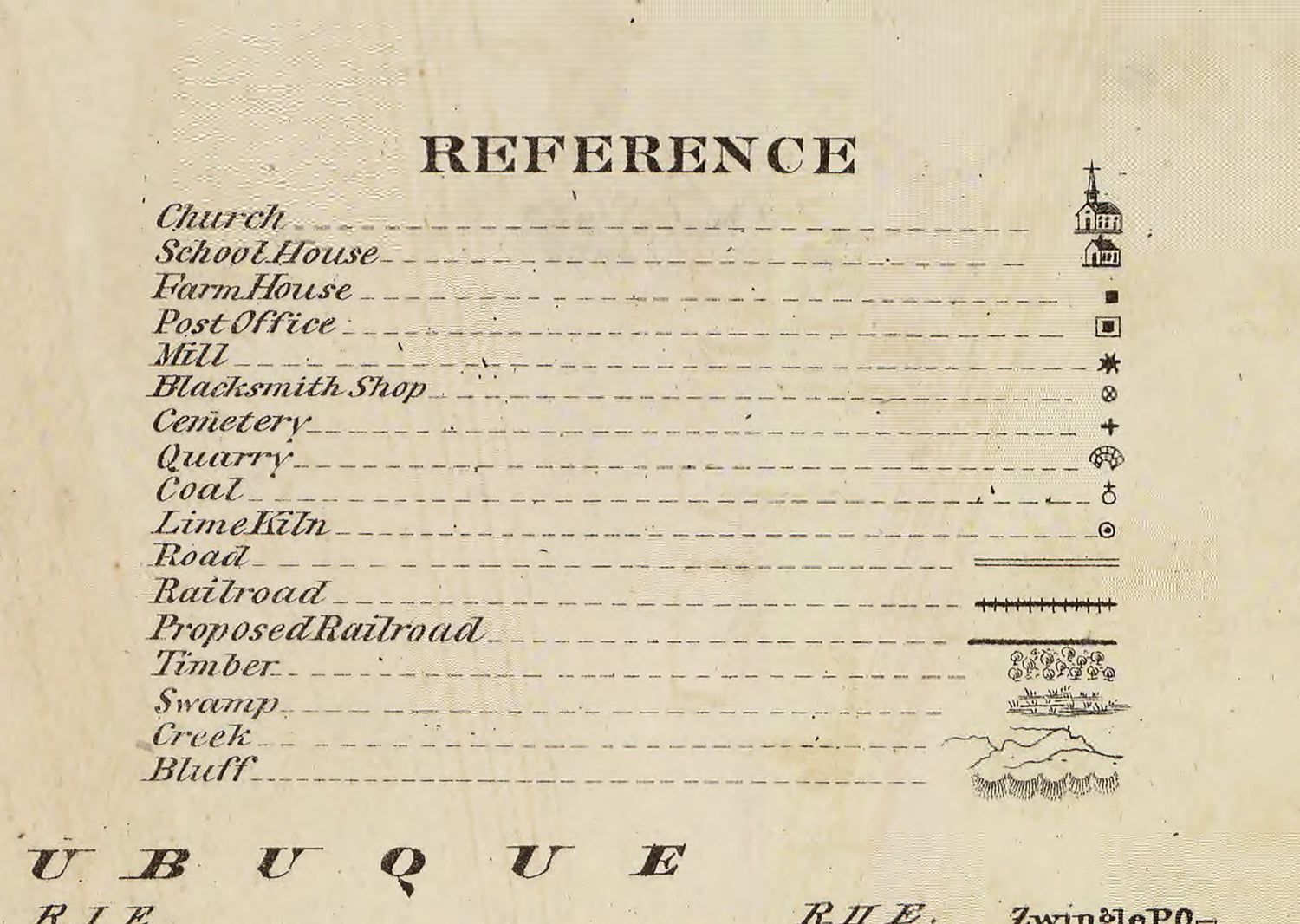 This map shows towns, roads, railroads, buildings, family names, schools, waterways, and more.