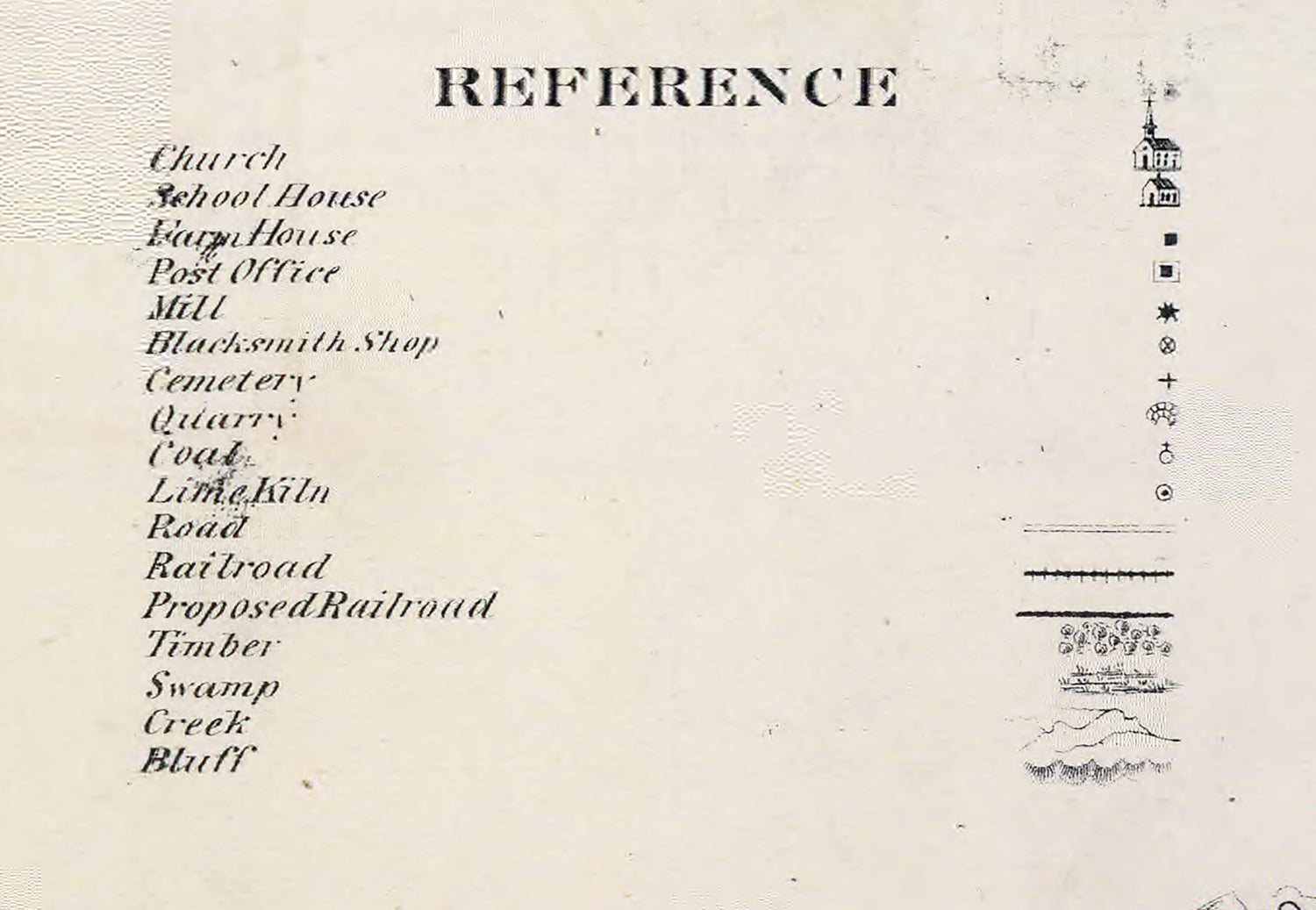 This map shows towns, roads, railroads, buildings, family names, schools, churches, waterways, and more.