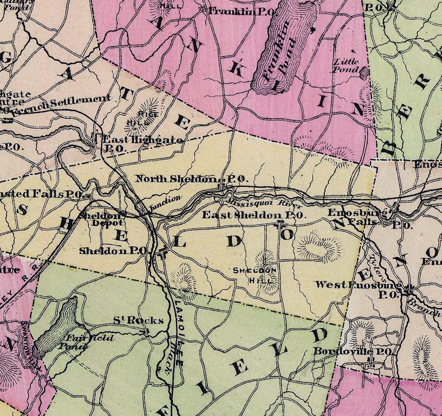 This map shows towns, roads, railroads, water ways, place names, and more.