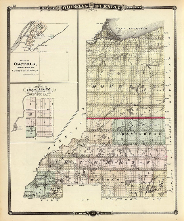 1878 Map of Douglas and Burnett County Wisconsin - 20" x 24" Matte is backordered and will ship as soon as it is back in stock.