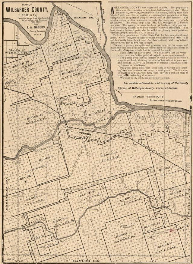 1887 Farm Line Map of Wilbarger County Texas - Heavy Weight Matte is backordered and will ship as soon as it is back in stock.