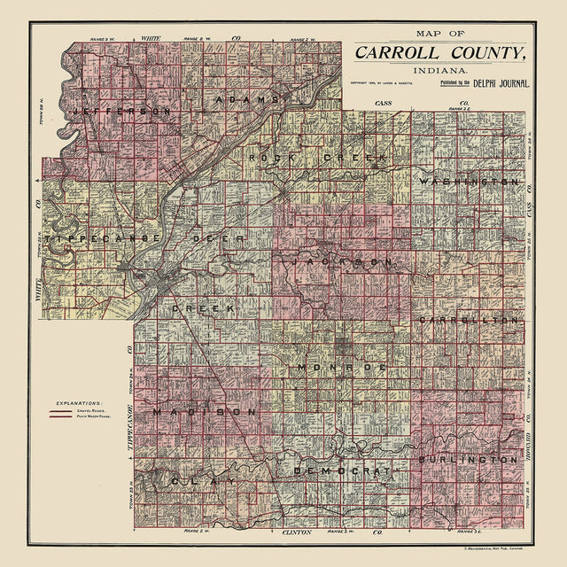 1898 Farm Line Map of Carroll County Indiana - 20" x 20" Matte is backordered and will ship as soon as it is back in stock.