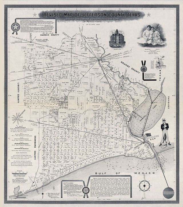 Historic map of Jefferson County, Texas showing property boundaries, names, historic places, schools, roads, rail roads, water ways, and more.