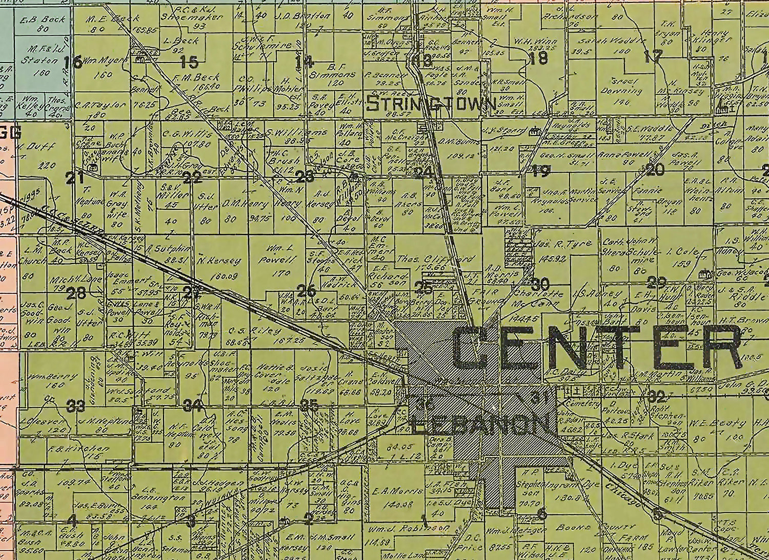 This map shows roads, railroads, towns, place names, boundary lines, landowner names, and more.