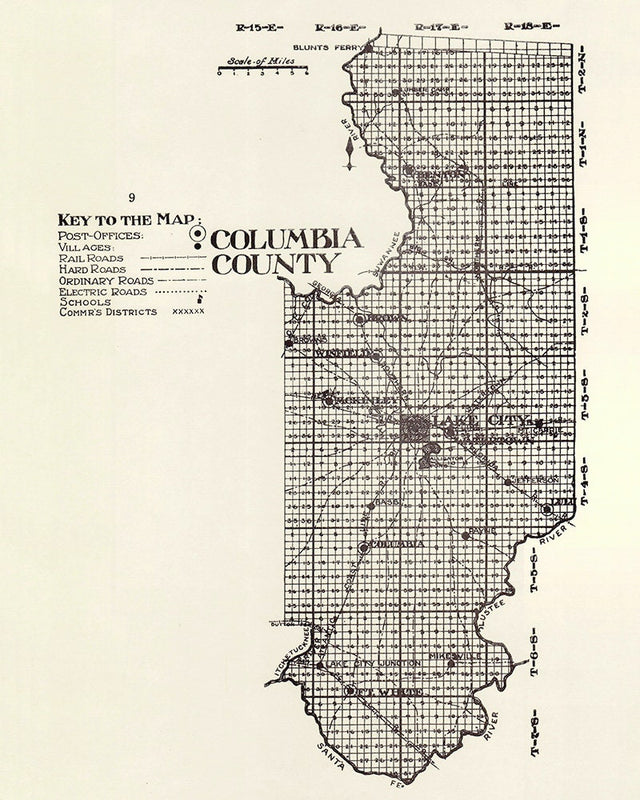 This is a very rare map of Columbia County, Florida showing historic places of interest, villages, post offices, rail roads, hard roads, electric roads, and schools.