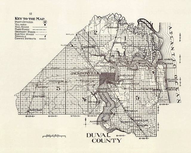 This is a very rare map of Duval County, Florida showing historic places of interest, villages, post offices, rail roads, hard roads, electric roads, and schools.