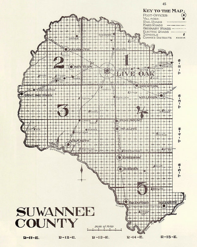 This is a very rare map of Suwannee County, Florida showing historic places of interest, villages, post offices, rail roads, hard roads, electric roads, and schools.
