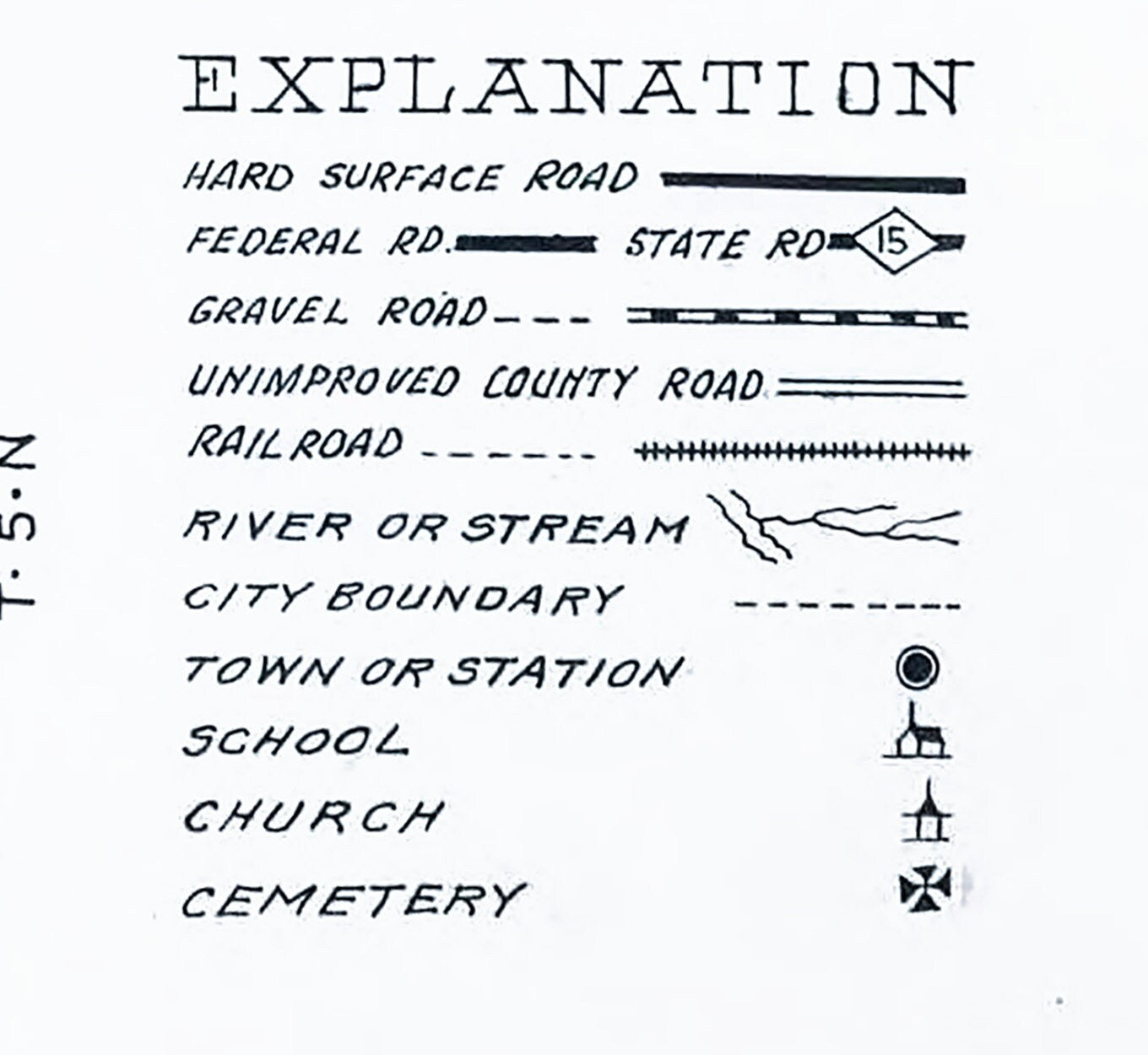 This map shows towns, roads, rail roads, schools, churches, cemeteries, lakes, and more.