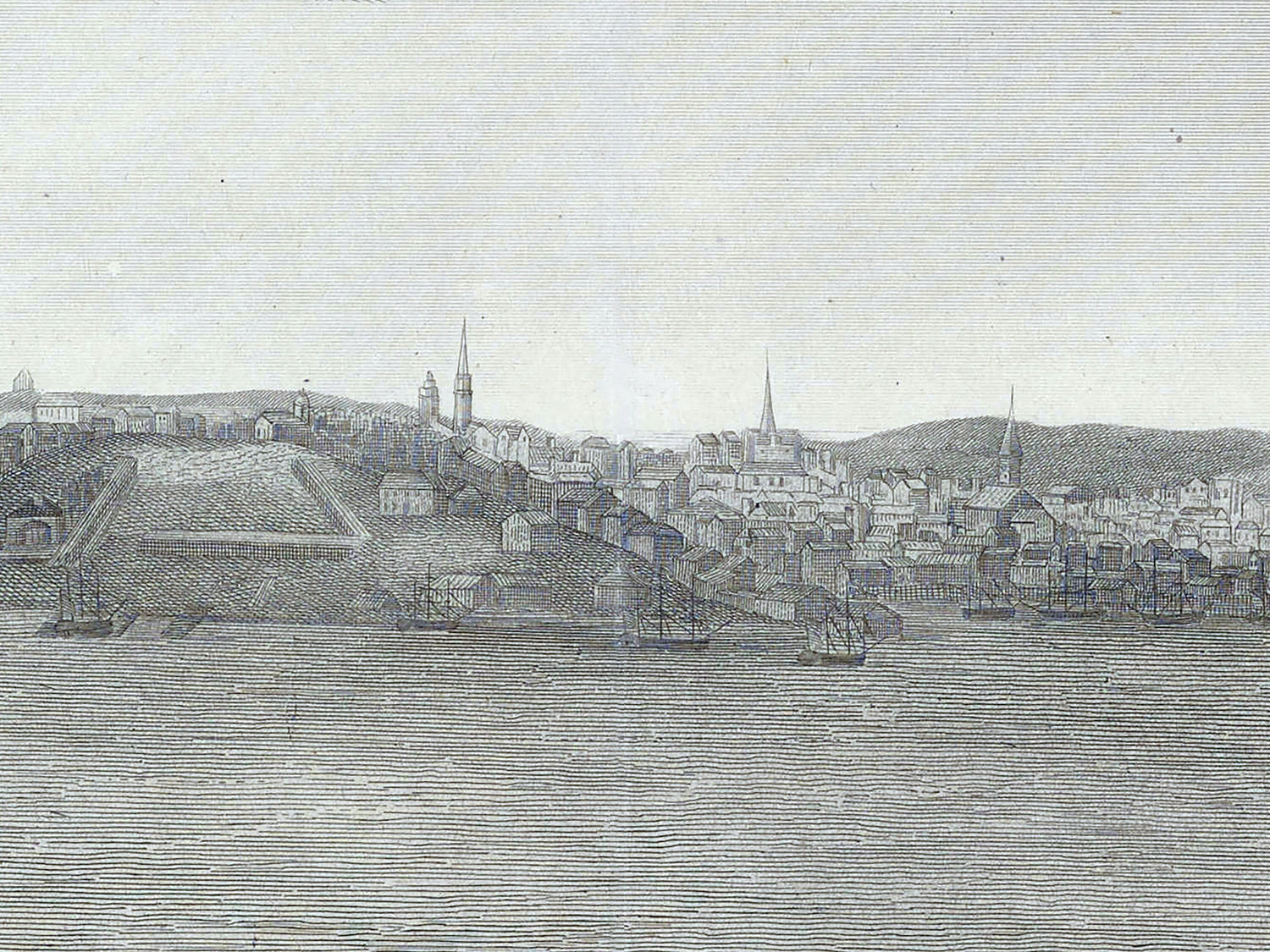 This map shows the landscape of the city of Boston including buildings and the harbor.