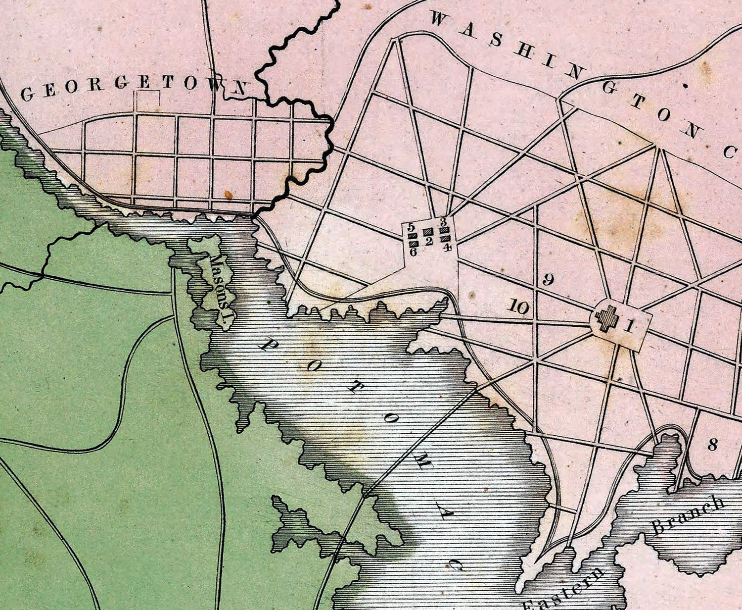 This map shows Georgetown, Washington, and Alexandria. It also shows major historical locations, roads, and waterways,