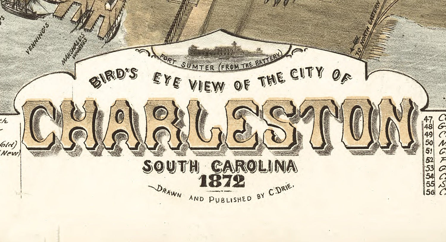 This map shows a detailed panoramic of Charleston including buildings, place names, roads, insets, shore line detail, and more.