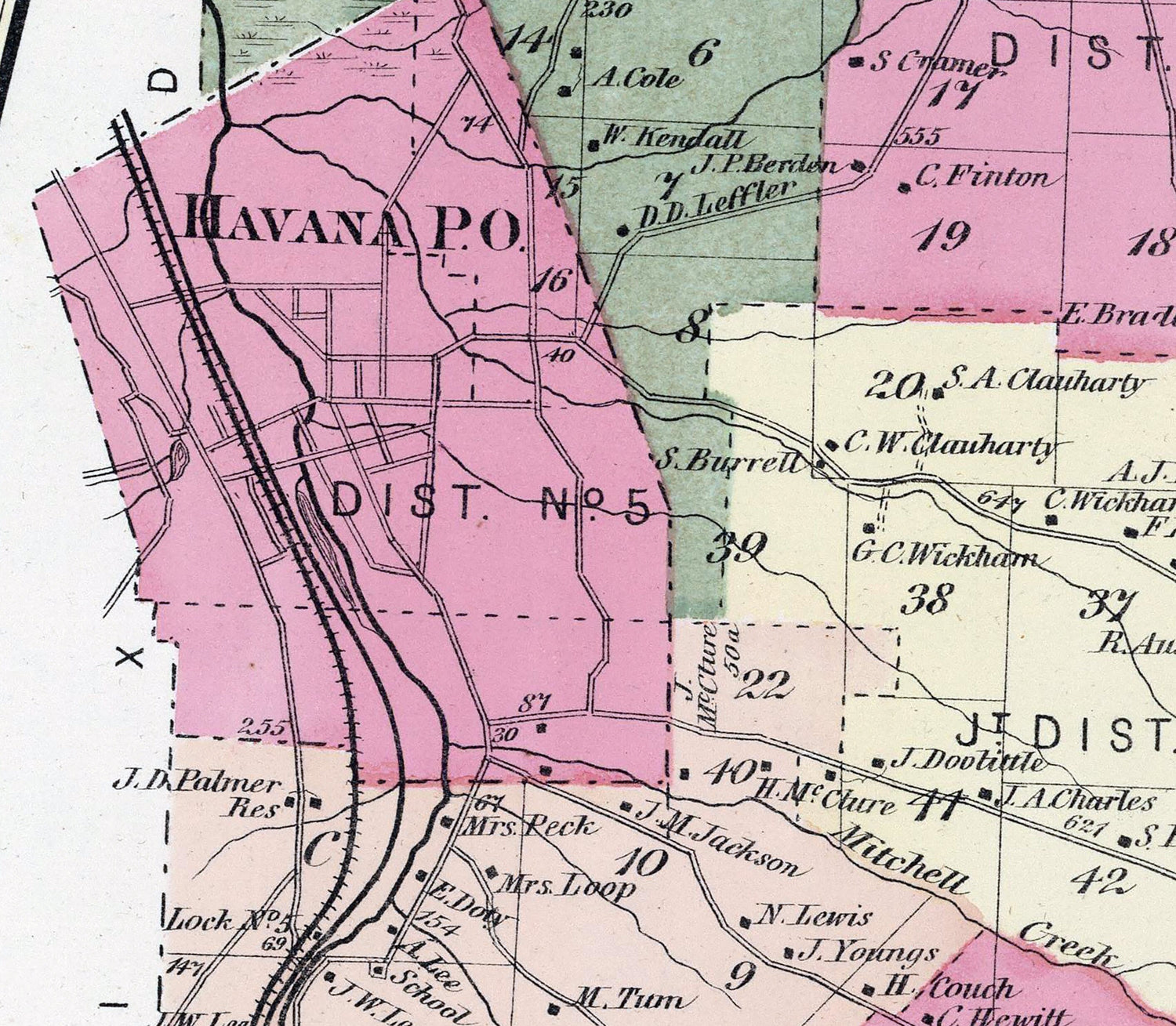 This map shows towns, roads, land owner names, buildings, historic places, and more.