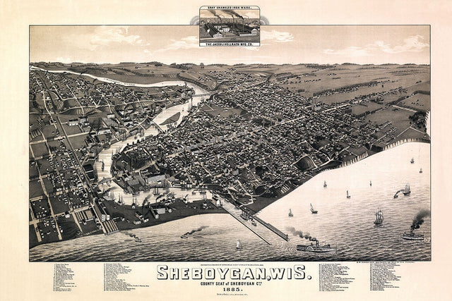 1885 Panoramic Map of Sheboygan Wisconsin Lake Michigan