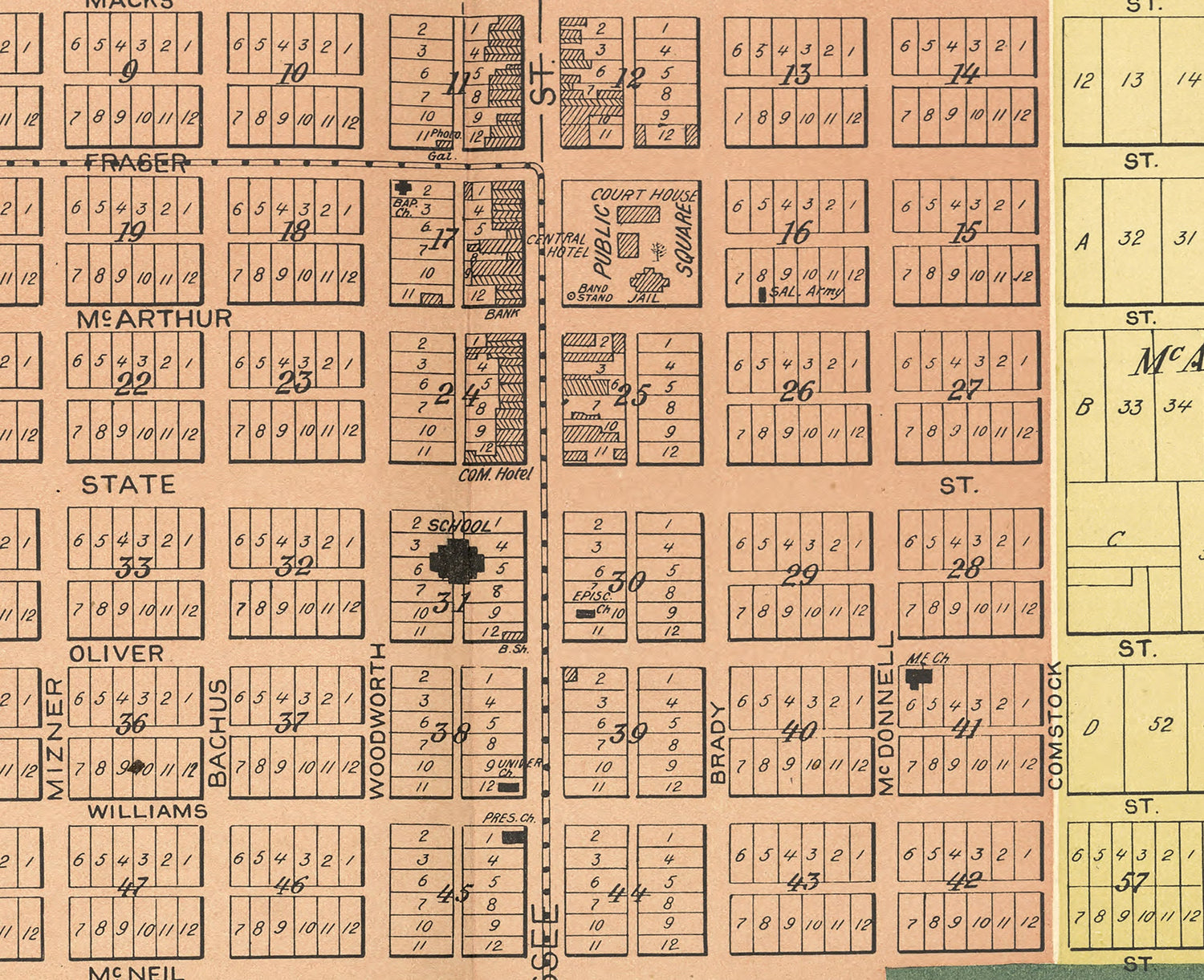 This map shows roads, road names, railroads, boundary lines, land owner names, buildings, place names, and more.