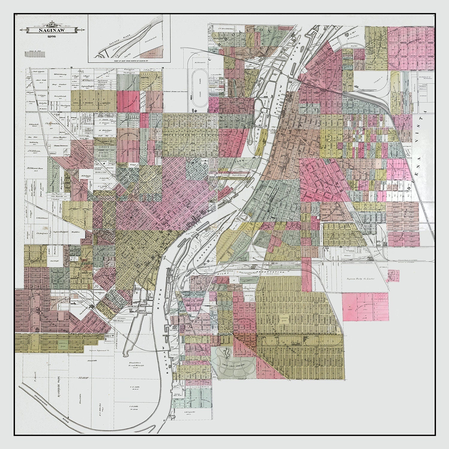 1896 Map of Saginaw Michigan - 30" x 30" Matte is backordered and will ship as soon as it is back in stock.