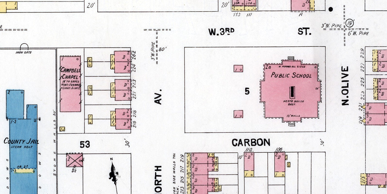 This town map shows roads, road names, lot boundaries, buildings, historic places, and more.