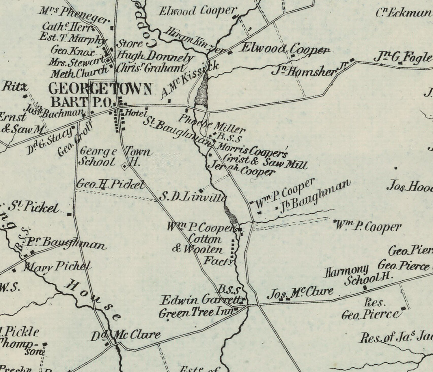 This map shows landowner names, buildings, historic places, roads, towns, and more.