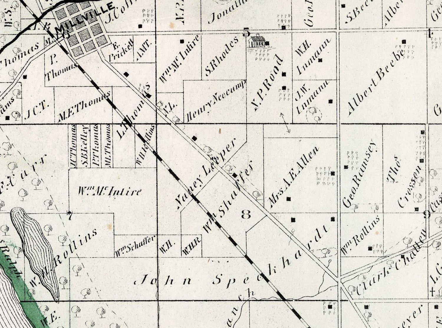 This map shows boundary lines, family names, buildings, roads, rail roads, towns, historic places, and more.