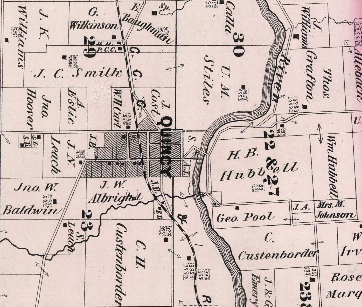 This map shows roads, boundary lines, land owner names, buildings, schools, churches, historic places, towns, and more.