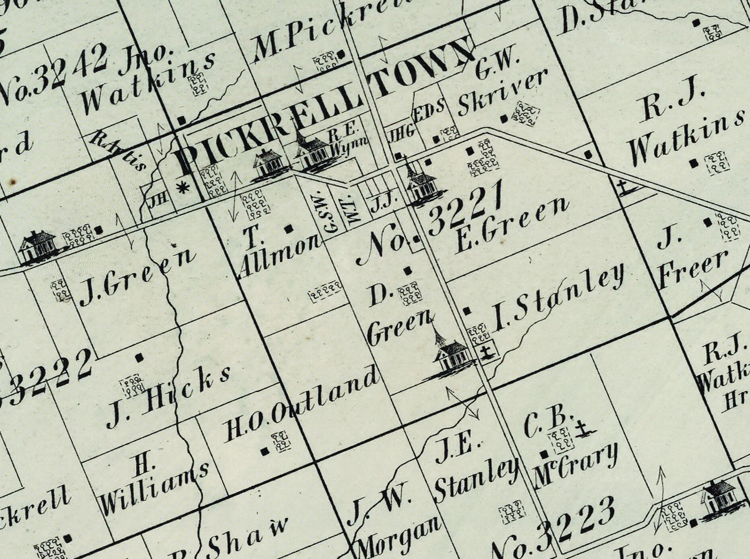 This map shows roads, boundary lines, land owner names, buildings, schools, churches, historic places, towns, and more.