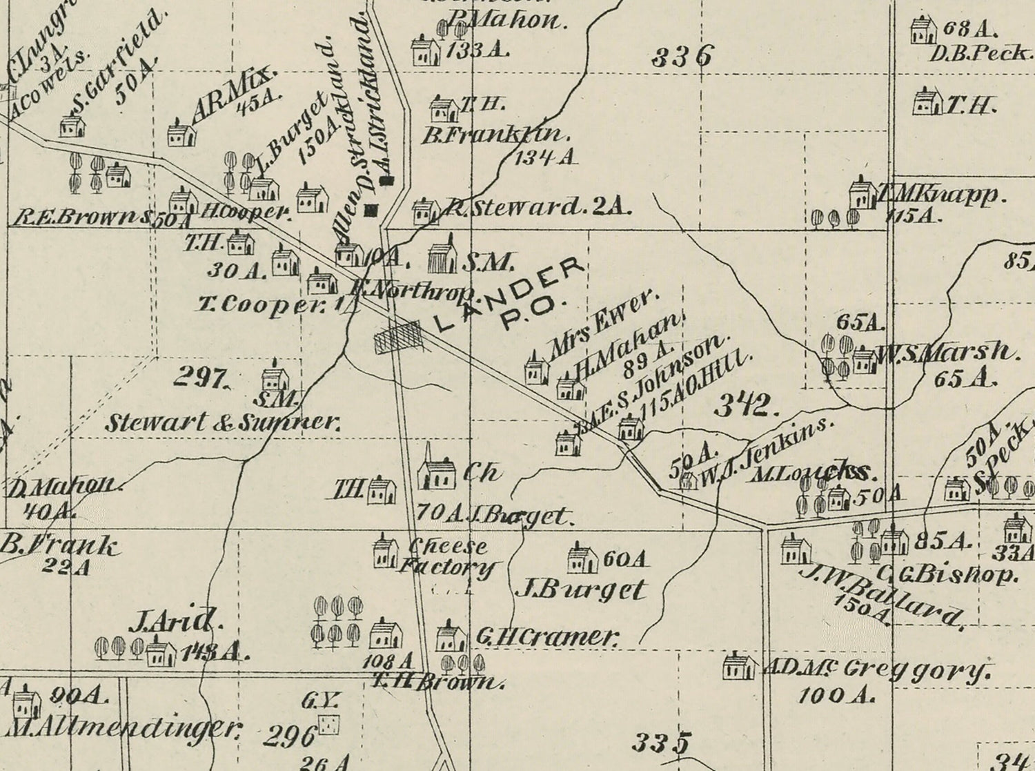 This map shows boundary lines, land owner names, roads, historic places, towns, and more.