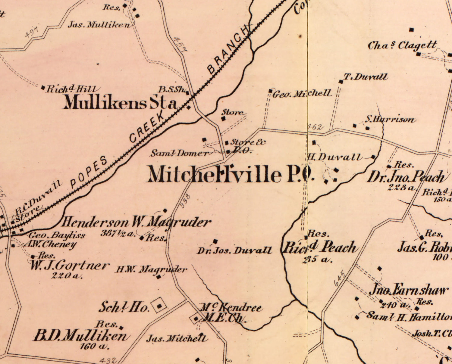 This map shows roads, railroads, family names, buildings, towns, and more.