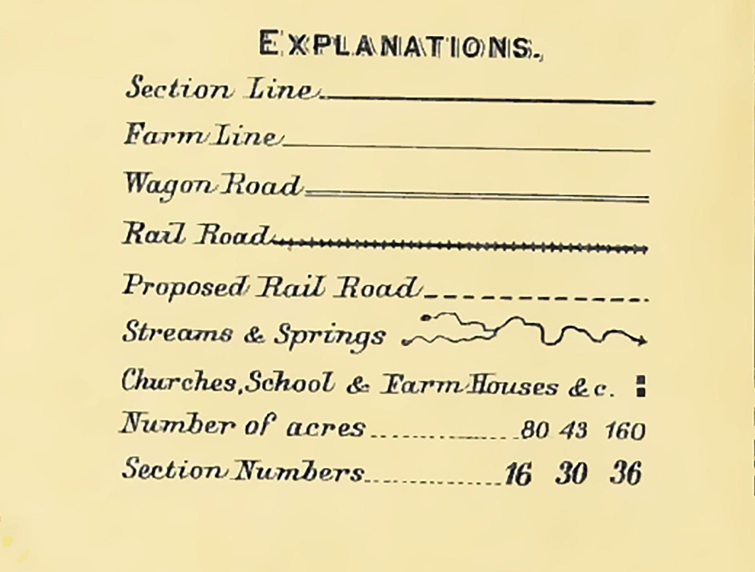 This map shows farm lines, family names, buildings, roads, waterways, towns, railroads, and more.