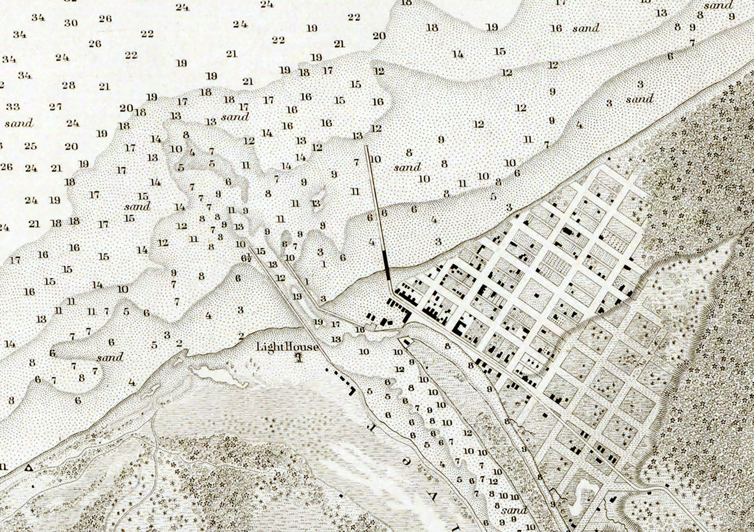 This map shows water depths, shore line detail, roads, buildings, historic places, and more.