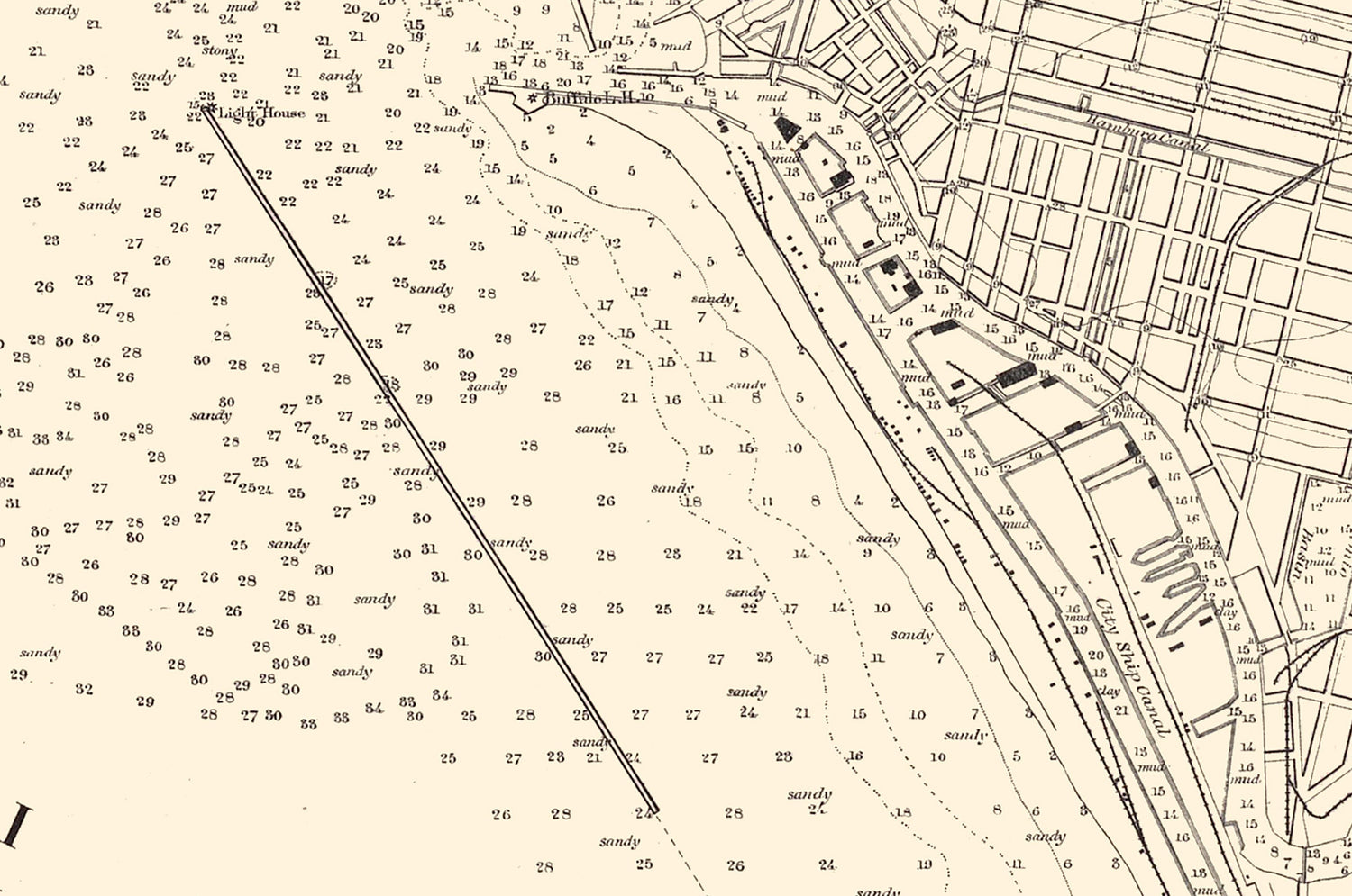 This map shows water depths, shore line detail, buildings, roads, and more.