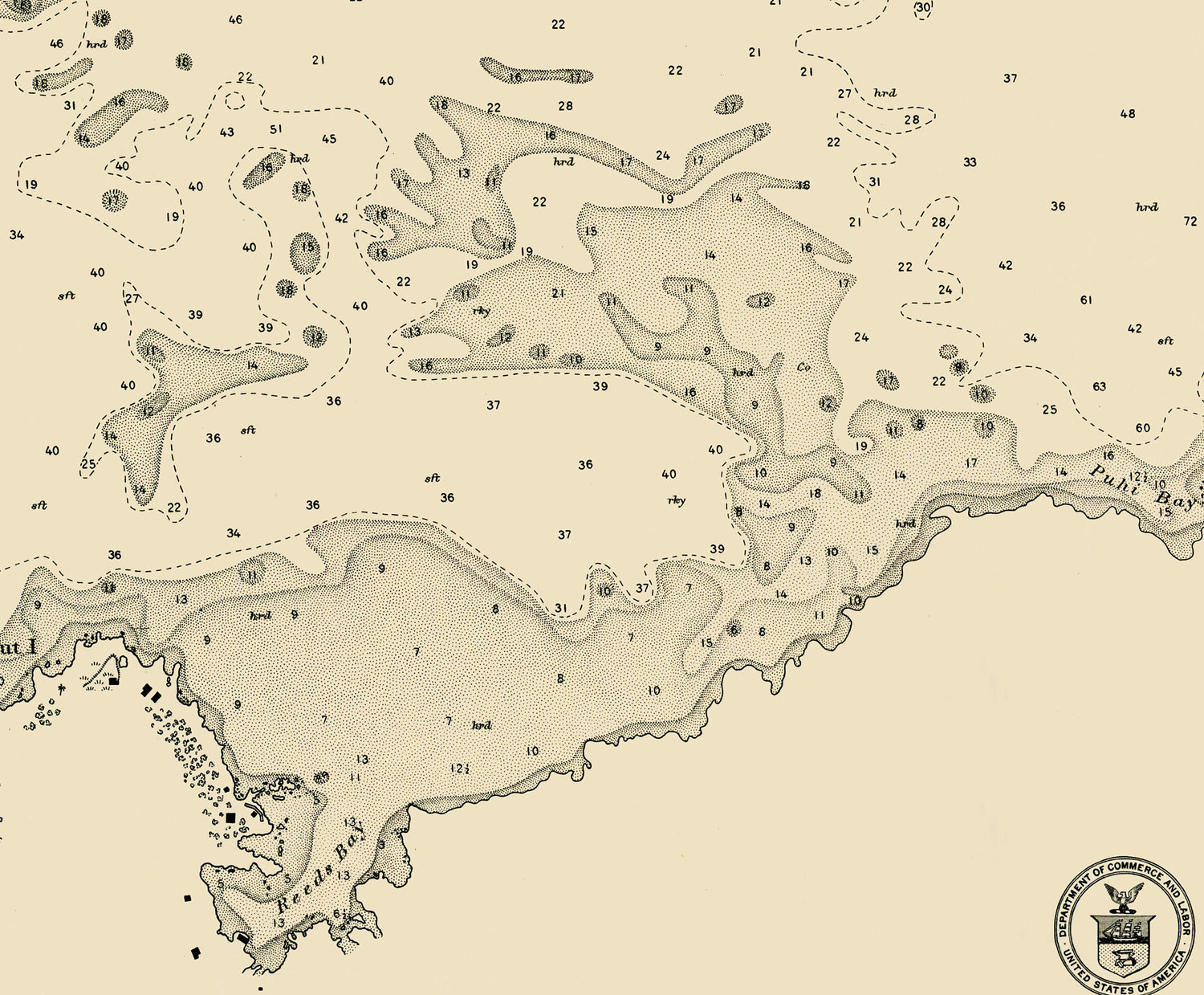 This map shows water depths, shore line detail, buildings, roads, place names, and more.