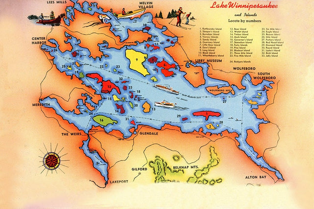 This map shows Lake Winnipesaukee and the names of the various islands within it.