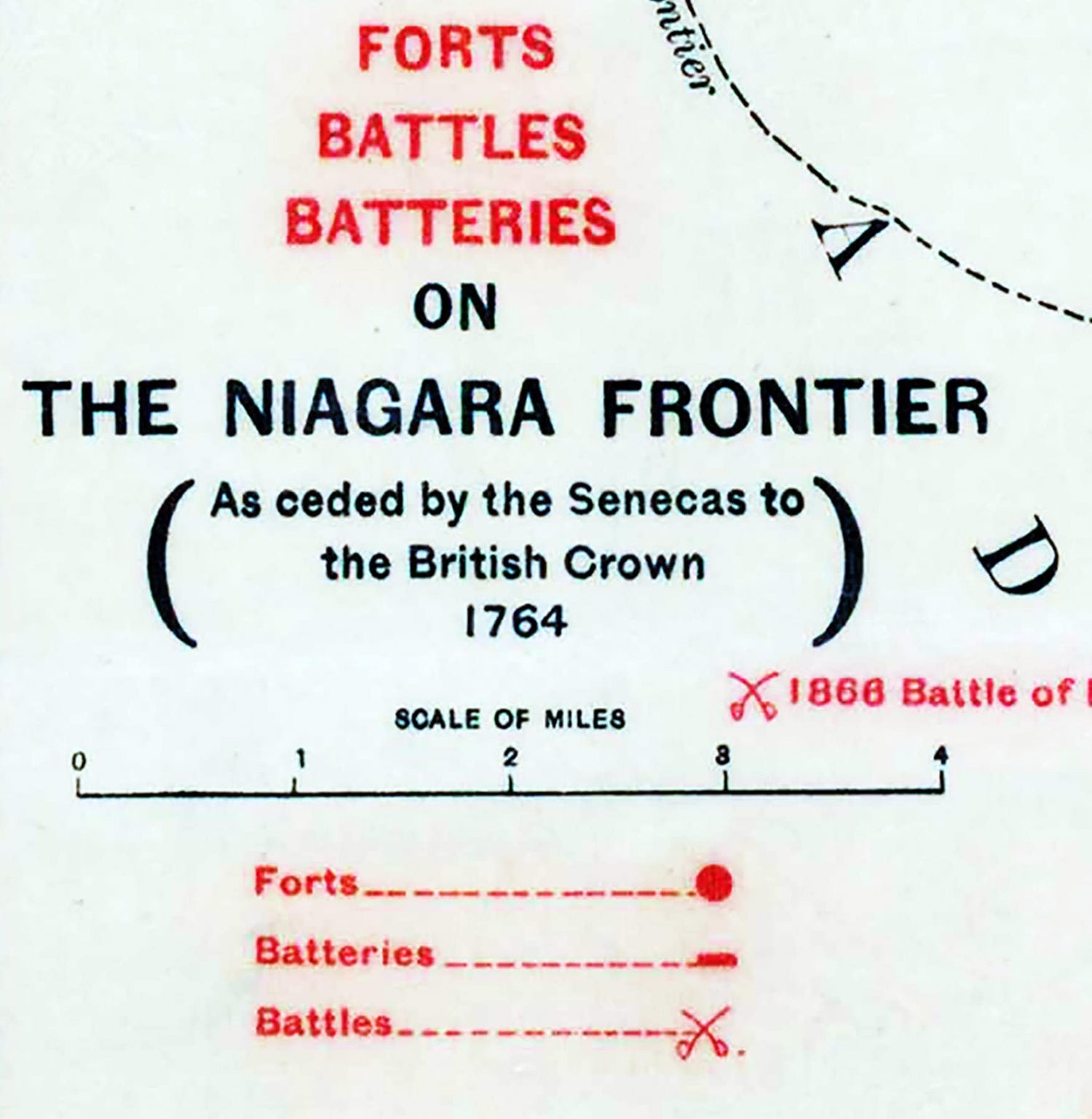 This map shows the locations of Forts, Battles, and Batteries along the Niagara River Frontier between Lake Erie and Lake Ontario.