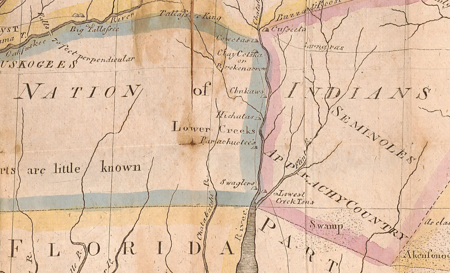 This map shows Indian Lands in Georgia including trails, villages, and the various Nations of Indians.