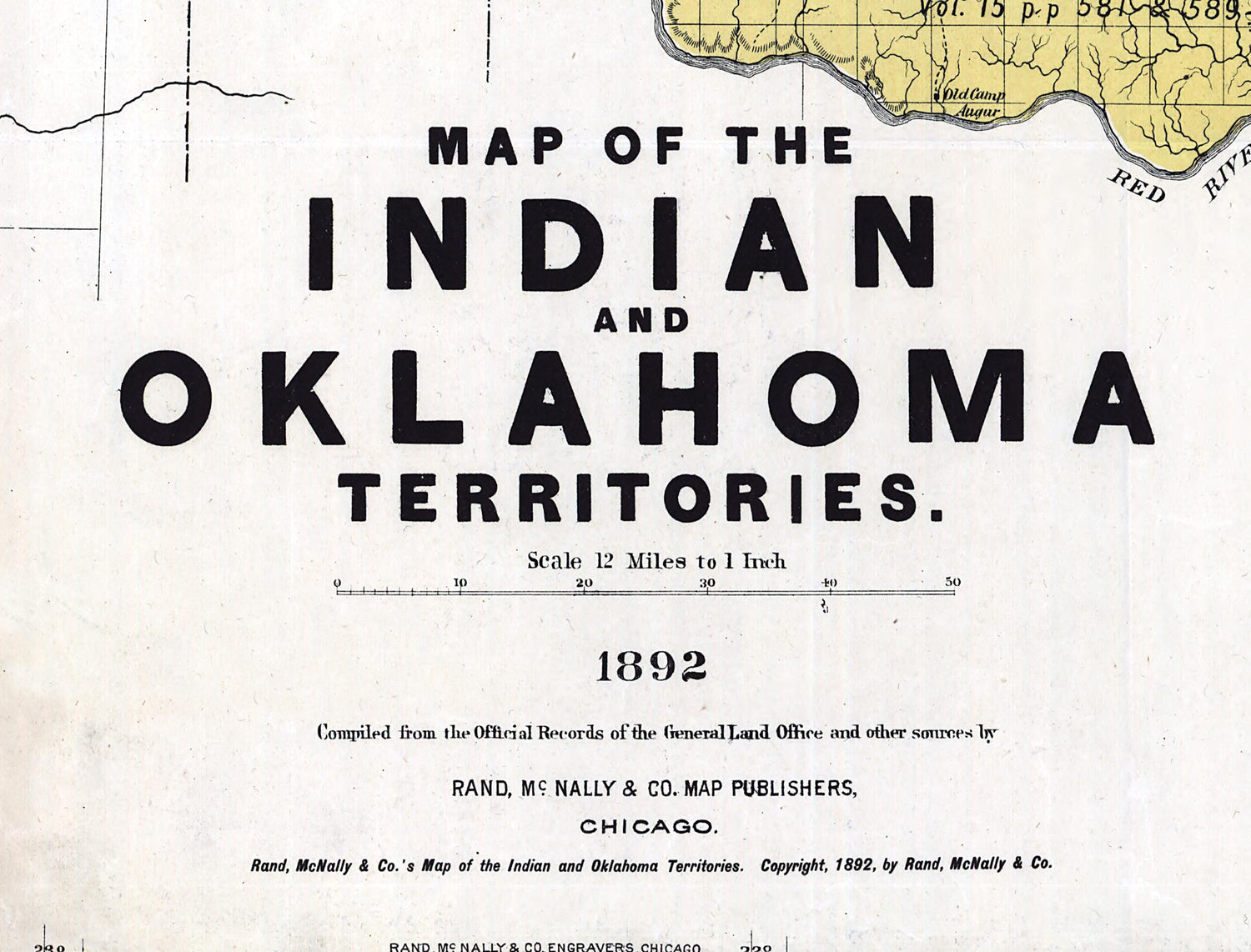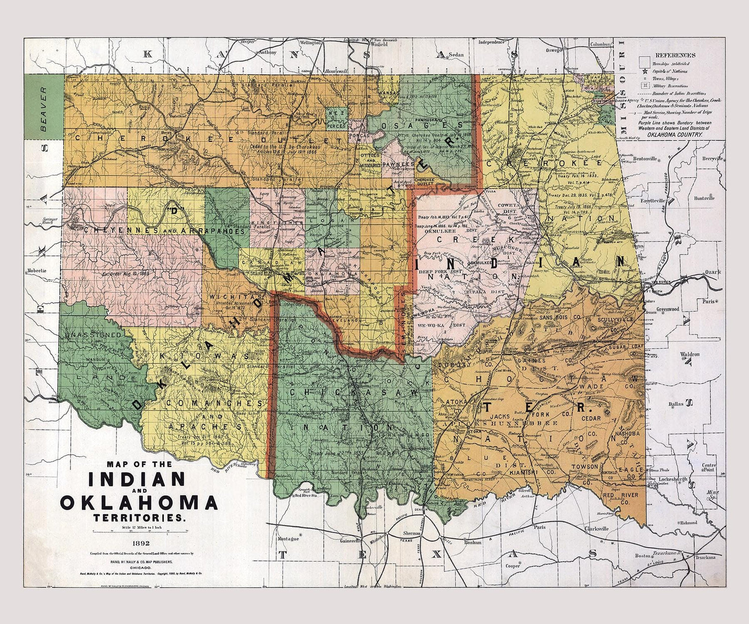 This map shows the Oklahoma Indian Territory. On the map are Indian Tribe Names, place names, railroads, waterways, terrain, and more.