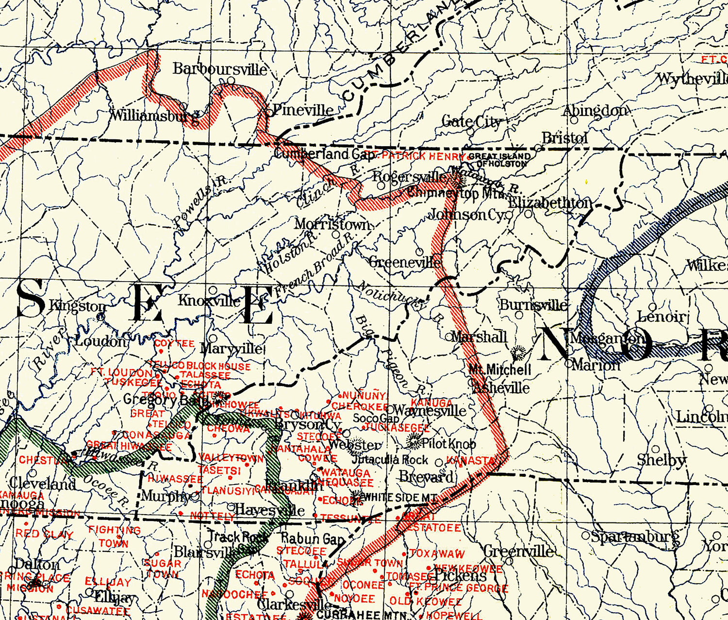 This map shows Cherokee Boundary lines, villages, towns, water ways, place names, and more.