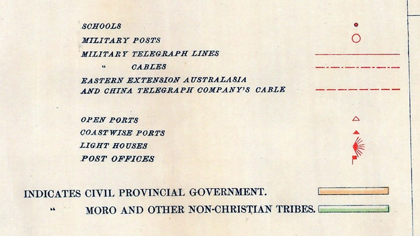 This map shows the Philippine Islands, terrain, schools, military locations, roads, and more.