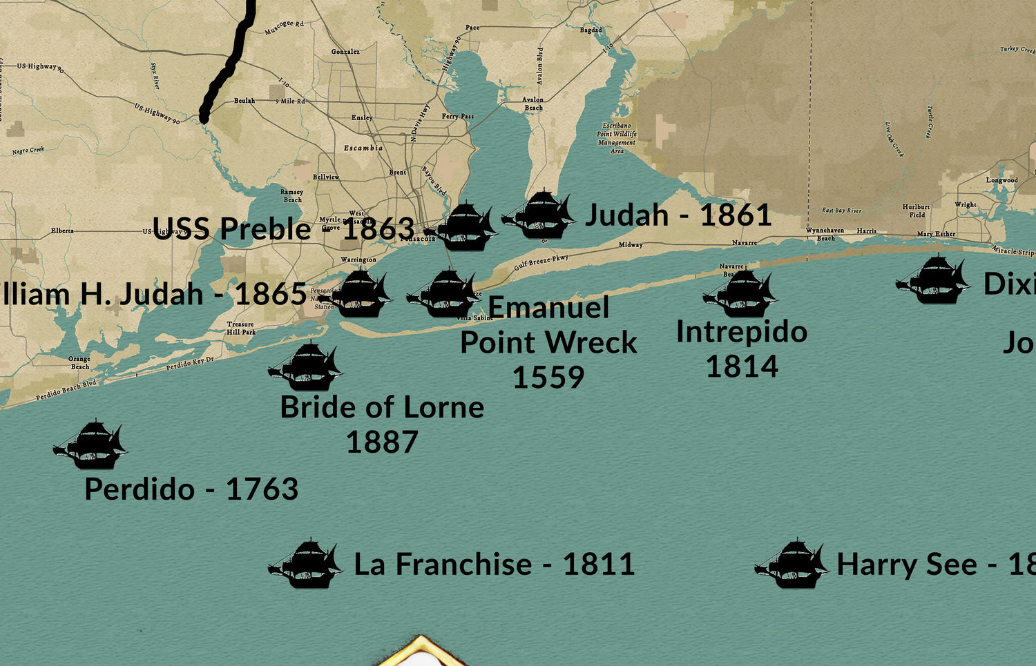 This map shows Shipwrecks of the Florida Panhandle from 1559 through 1924. Including ships names, wreck dates, shore line detail, onshore roads and place names, ship inset drawings, and more.