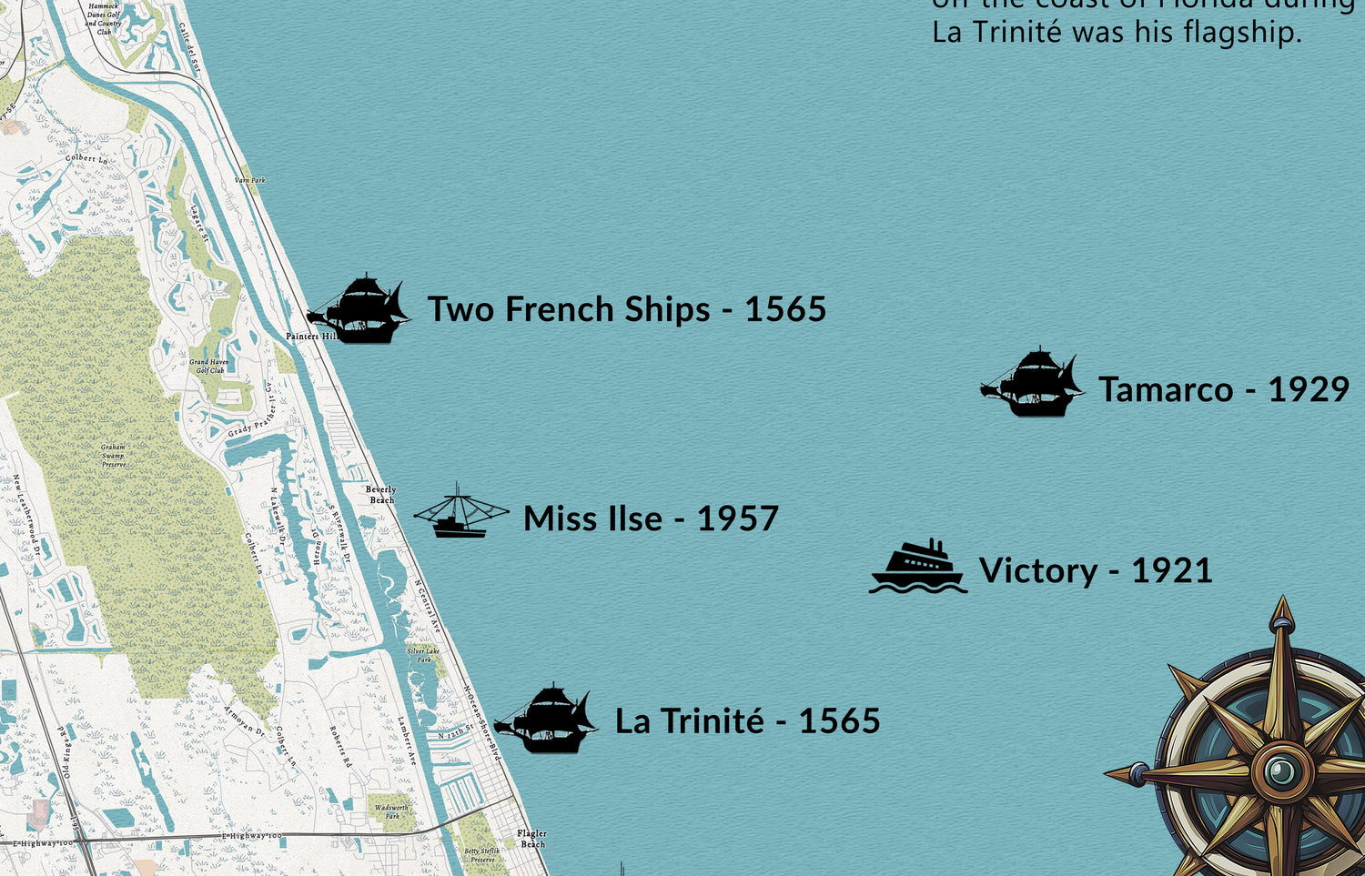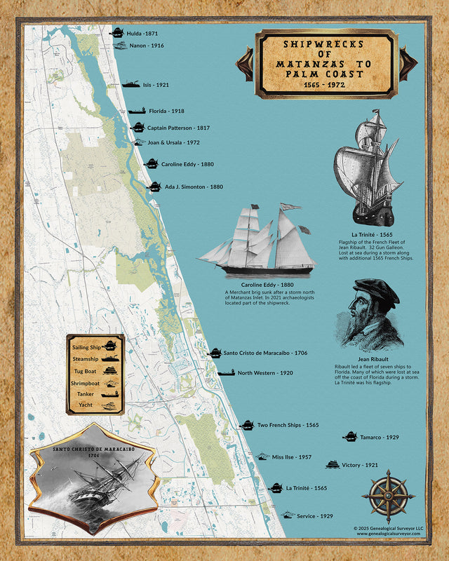 This map shows Shipwrecks from Matanzas Inlet to Palm Coast, Florida during the time frame of 1565 to 1972. Including ships names, wreck dates, shore line detail, onshore roads and place names, ship inset drawings, and more.