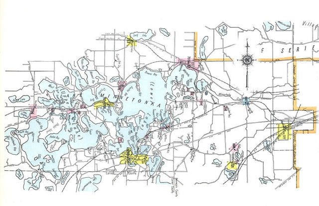 This map shows Lake Minnetonka, shore lines, islands, roads, railroads, and more.
