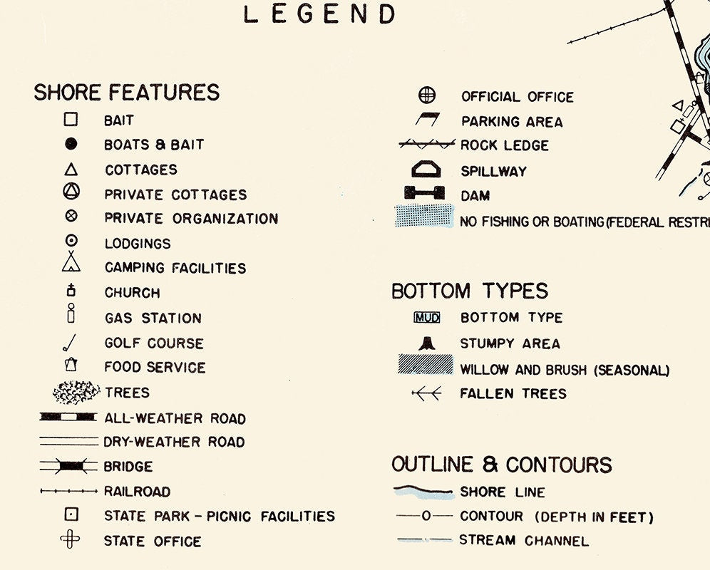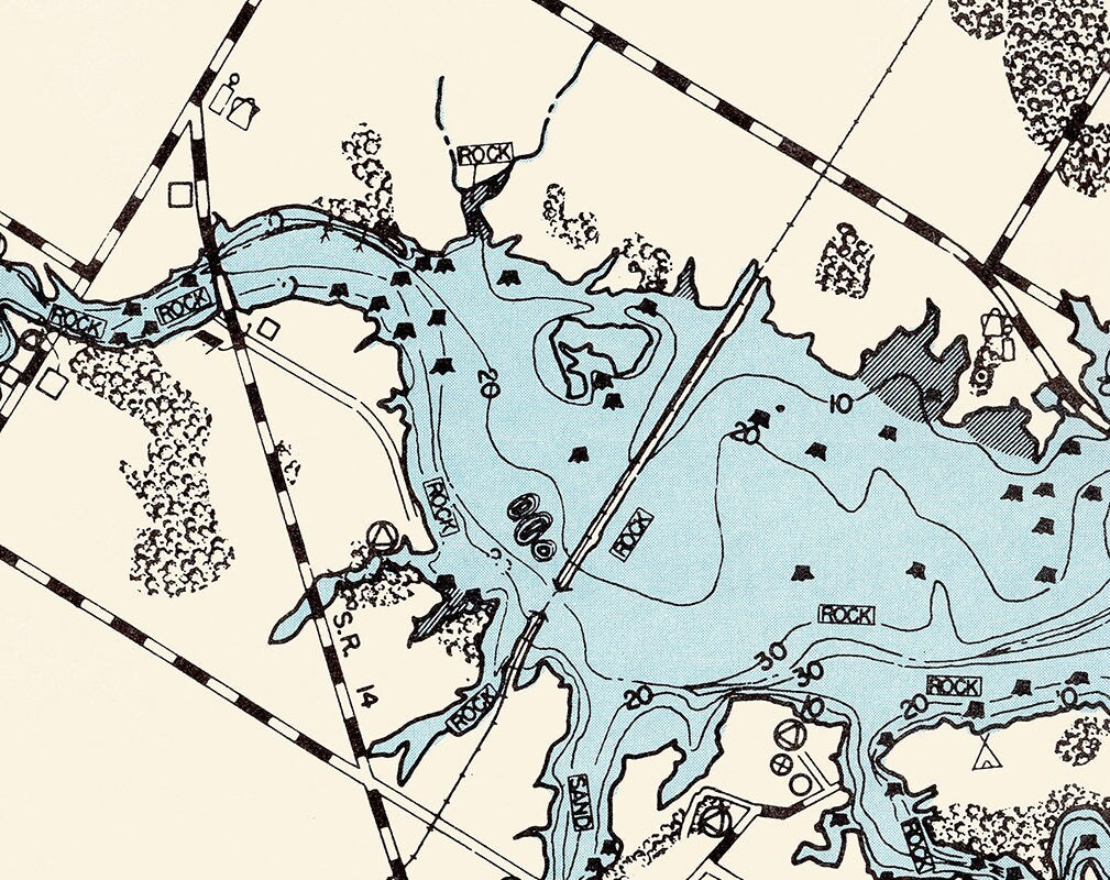 This map shows shows the lake, depths, shore line detail, roads, trees, marshy areas, and more.
